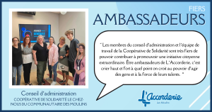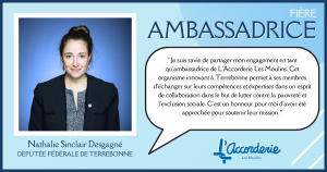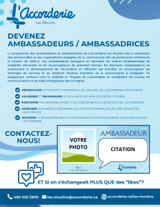 Les ambassadeurs de L’Accorderie Les Moulins sont des personnes ou organisations qui nous aident à faire rayonner notre mission dans la communauté : visibilité, soutien logistique, financement, engagement bénévole… chaque geste compte!