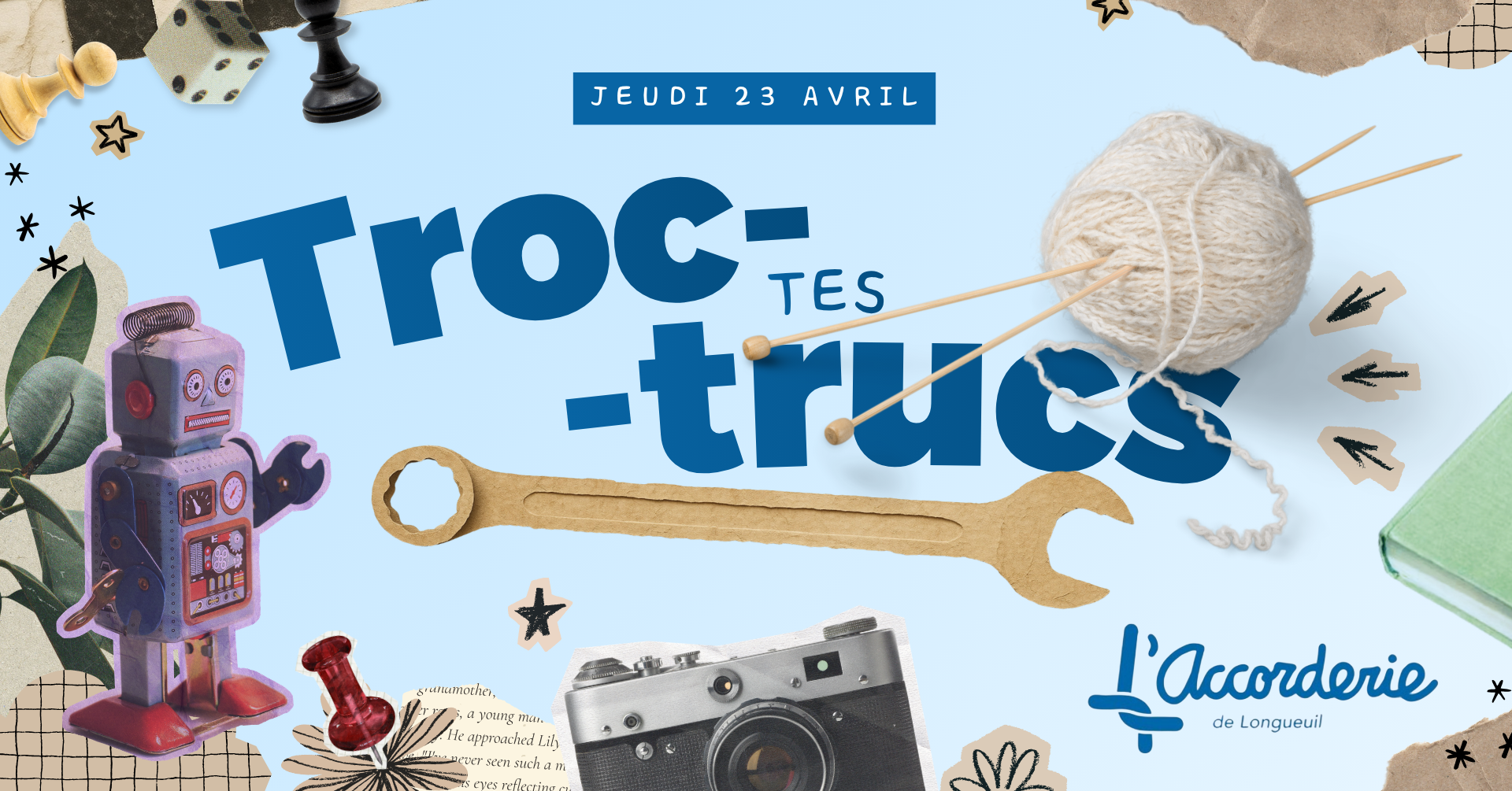 Tous nos membres sont invités à participer, le jeudi 23 avril prochain, à un échange d’objets en bon état entre membres. Une belle occasion de faire circuler des objets qui ne servent plus et de leur trouver une nouvelle utilité. L’activité sera agrémentée d’un léger goûter et de rafraîchissements offerts par le comité de vie associative. Objets acceptés : livres, vaisselle, articles décoratifs, jeux et accessoires pour enfants, matériel d’art et outils.